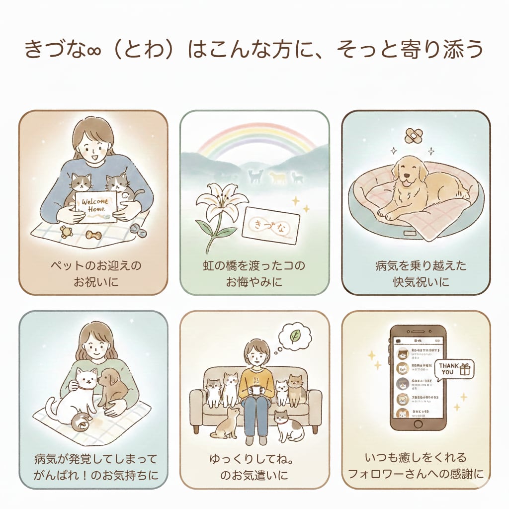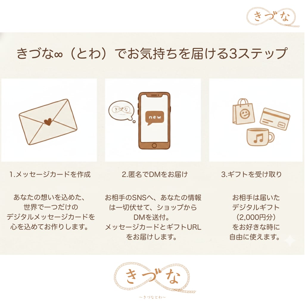 「きづな♾️(とわ)」は、SNSでつながる方へ、お名前や住所を伏せたまま「お祝い」や「お悔やみ」のお気持ちを届ける代理送付サービスです。